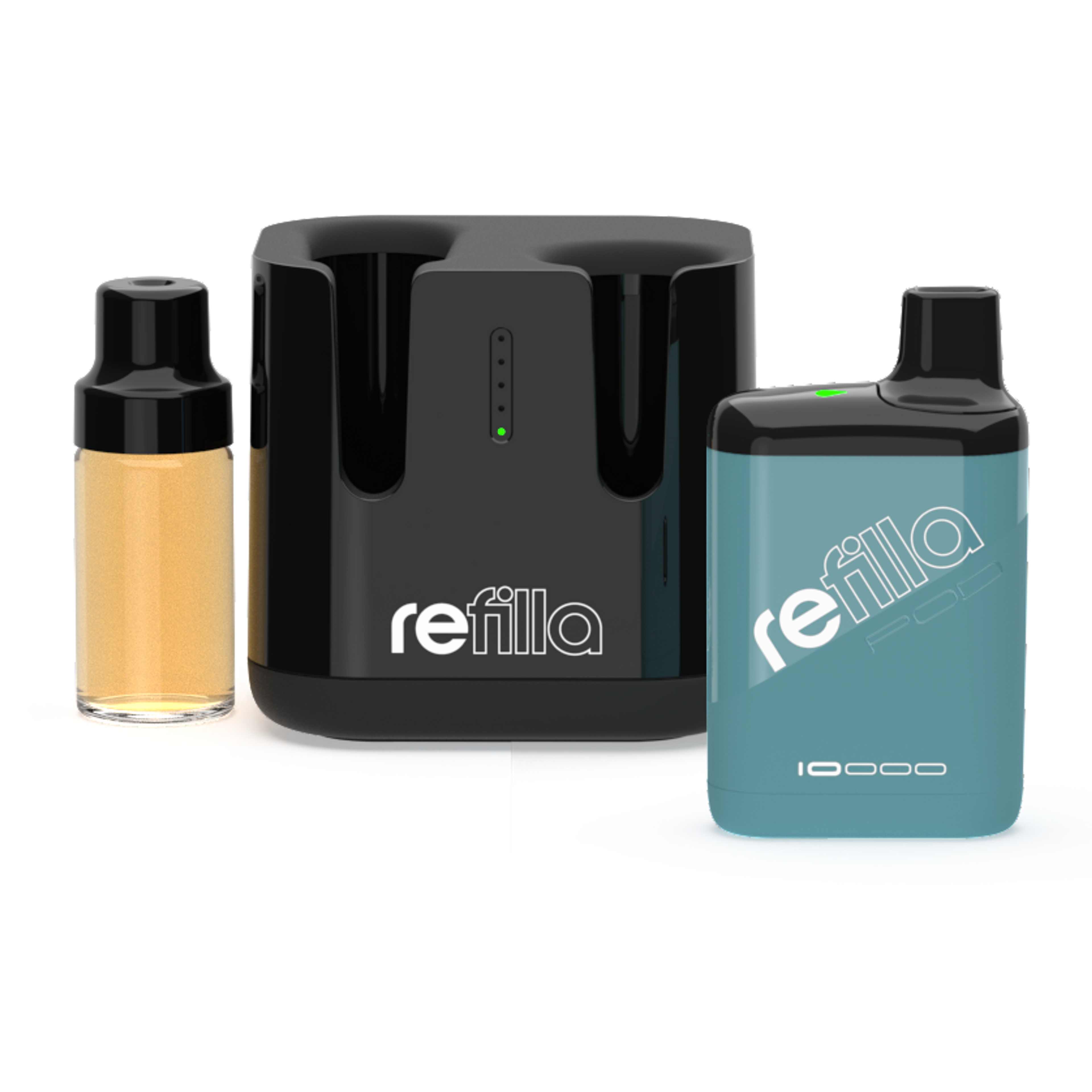 Refilla can be charged on the go using any USB-C charging device but, to get the best out of Refilla, we recommend you use a Refilla Dock and Refilla compatible liquid bottles. This allows you to refill the pod up to 16 times - that's 10,000 puffs!